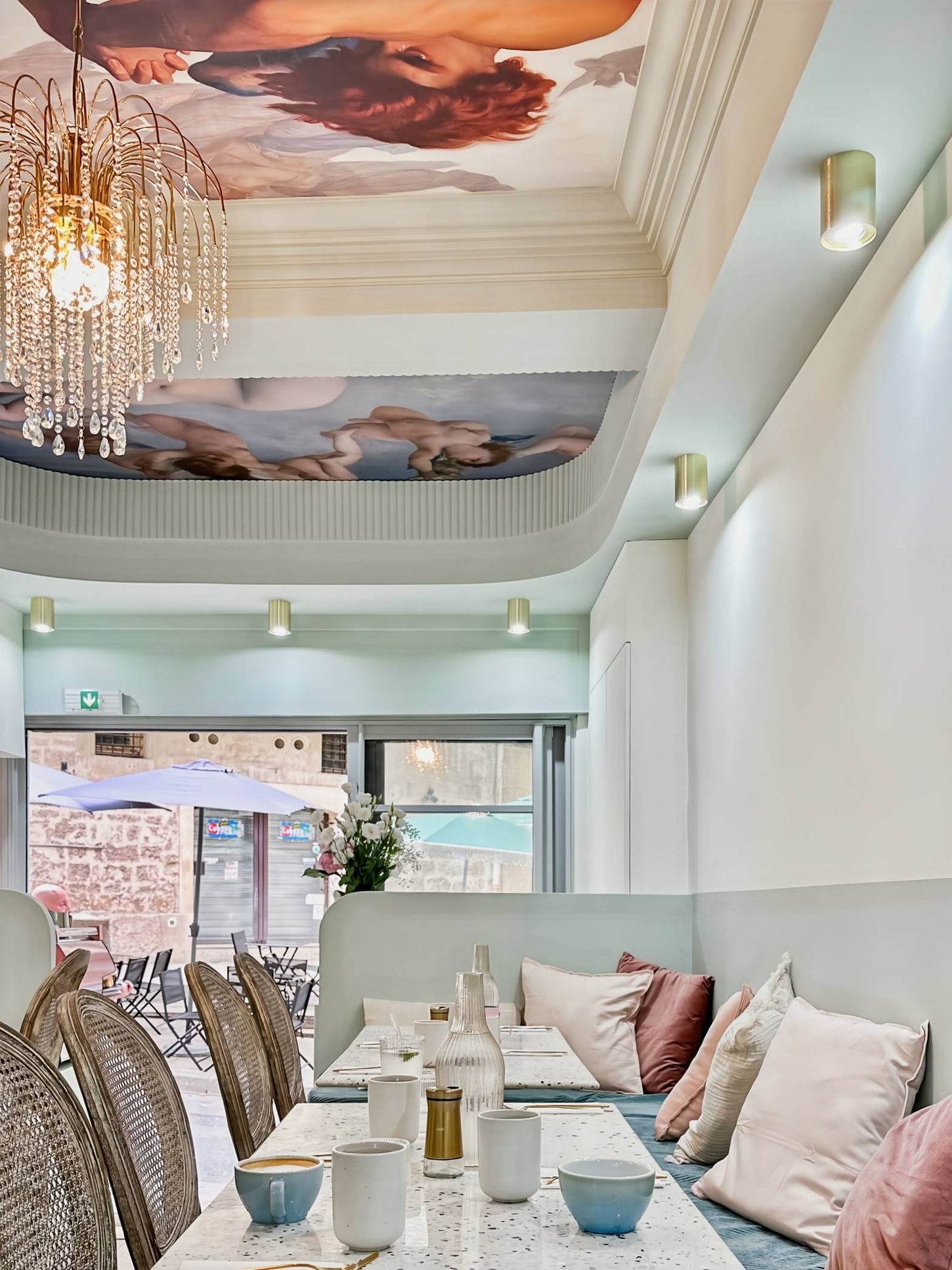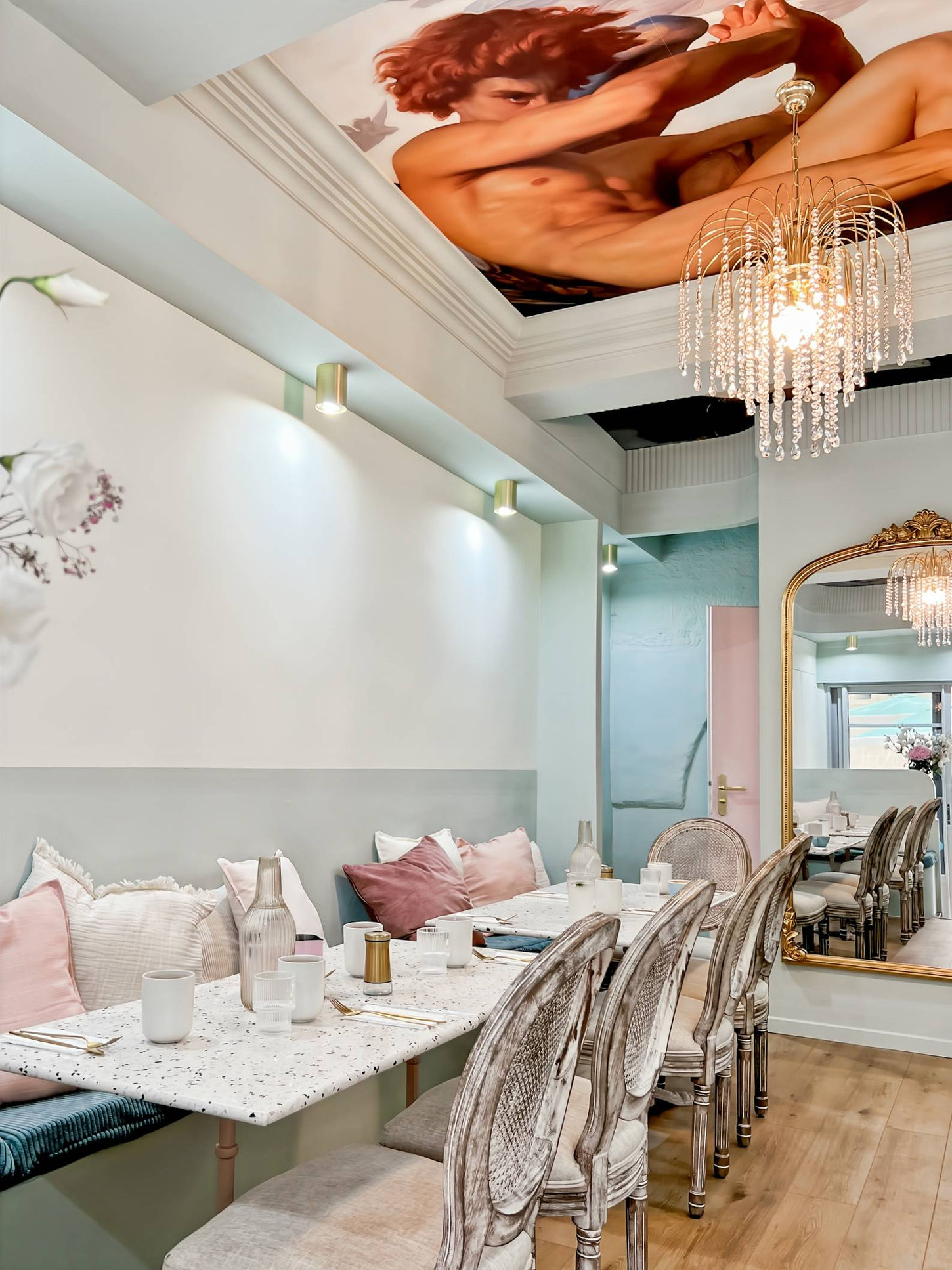 The concept begins with a desire to reconnect the space to the artistic heritage of Montpellier. The ceiling becomes the central canvas of this narrative, where large-scale wallpapers recreate three iconic works by 19th-century Montpellier-born painter Alexandre Cabanel: L’Ange Déchu, La Naissance de Vénus, and Pandora’s Box. These reproduced frescoes bring a dramatic, celestial presence to the space, transforming the café into a contemporary salon where art envelops the visitor from above.